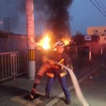 久宝寺駅前で火事やわ。 駅のホームの方にもプラスチックの燃える匂いがする。