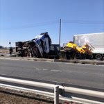 294下り鯨の信号先〜事故通行止めになっています!ダンプカー横転!大型の重機を乗っけているトラックが重機転落!大型のウイング車は海コンのトレーラーに追突!大型トラック4台の大事故です🚛🚛🚛🚛#くにまる https://t.co/Rsf03NgYM8