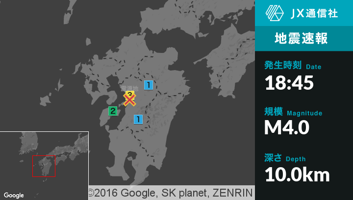 | 震度1 | 熊本県阿蘇, 熊本県球磨, 福岡県福岡, 長崎県南西部, 佐賀県南部, 鹿児島県薩摩 |
