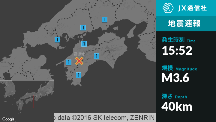 | 震度1 | 浅口市, 三原市, 尾道市, 柳井市, 周防大島町, 今治市, 西条市, 宇和島市, 西予市, 内子町, 松野町, 愛南町, いの町, 宿毛市, 黒潮町 |