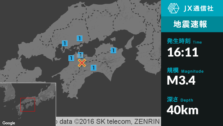 | 震度1 | 三原市, 尾道市, 呉市, 江田島市, 徳島三好市, 四国中央市, 久万高原町, 本山町, 土佐町, 大川村, いの町 |
