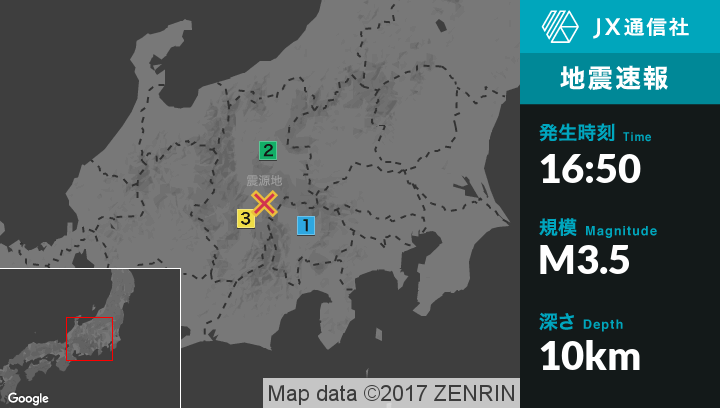 | 震度1 | 辰野町, 箕輪町, 南箕輪村, 中川村, 長野高森町, 阿智村, 木曽町, 塩尻市, 立科町, 富士見町, 原村, 山梨北杜市 |
