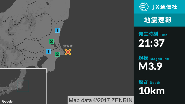| 震度1 | 土浦市, 茨城鹿嶋市, 稲敷市, 鉾田市, 笠間市, 香取市, 山武市, 多古町, 芝山町, 横芝光町, 野田市, 成田市 |