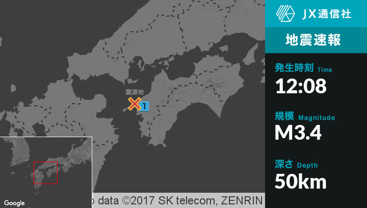 | 震度1 | 宇和島市, 八幡浜市, 大洲市, 西予市, 内子町, 松野町 |