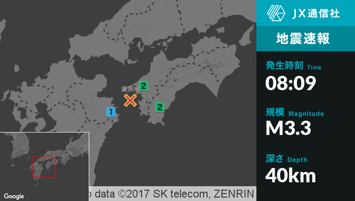 | 震度1 | 宇和島市, 大洲市, 伊方町, 松野町, 愛南町, 佐伯市 |