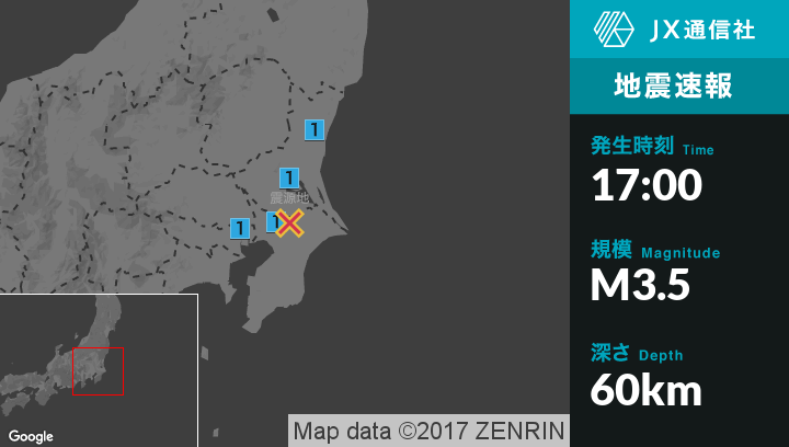 | 震度1 | 水戸市, 笠間市, 土浦市, 石岡市, 取手市, つくば市, 稲敷市, 千葉花見川区, 野田市, 成田市, 八千代市, 東京北区 |