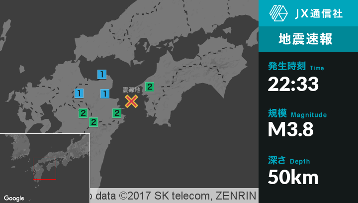 | 震度1 | 宇和島市, 大洲市, 伊方町, 産山村, 豊後大野市, 国東市, 大分市, 臼杵市, 津久見市, 由布市, 竹田市, 日之影町 |