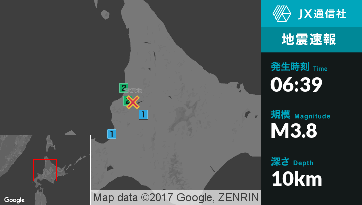 | 震度2 | 秩父別町, 北竜町, 沼田町, 増毛町, 小平町 |