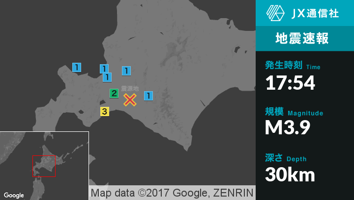 | 震度1 | 苫小牧市, 登別市, 白老町, 恵庭市, 石狩市, 札幌北区, 札幌東区, 札幌南区, 札幌手稲区, 江別市, 函館市, 小樽市, 余市町, 由仁町, 日高地方日高町, 平取町 |