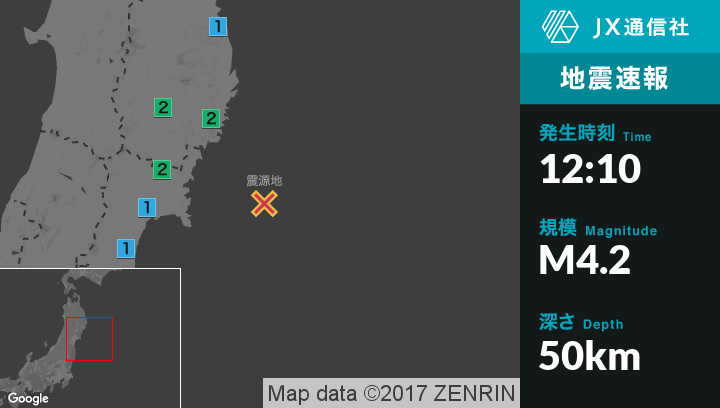 | 震度2 | 大船渡市, 釜石市, 一関市, 気仙沼市 |