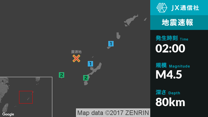 | 震度1 | 那覇市, 宜野湾市, 沖縄市, うるま市, 南城市, 読谷村, 中城村, 西原町, 渡名喜村, 名護市, 国頭村, 今帰仁村, 本部町, 恩納村, 粟国村, 与論町 |