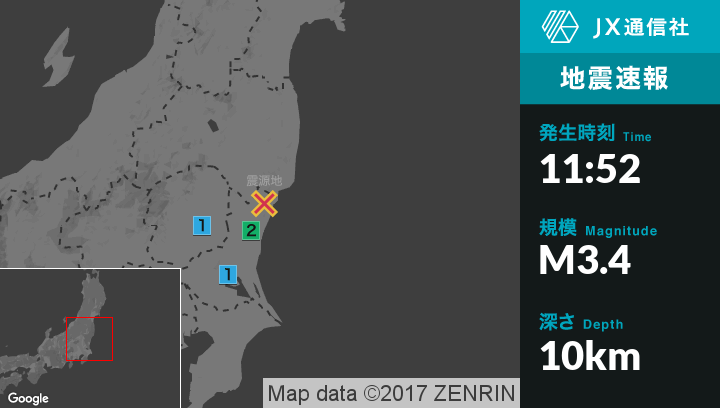 | 震度1 | 水戸市, 日立市, 北茨城市, 笠間市, 常陸大宮市, 城里町, 土浦市, 宇都宮市 |