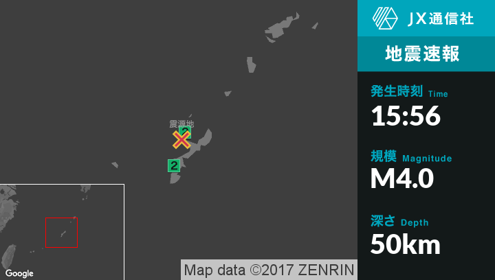 | 震度2 | 名護市, 国頭村, 今帰仁村, 本部町, 恩納村, 宜野座村, うるま市 |