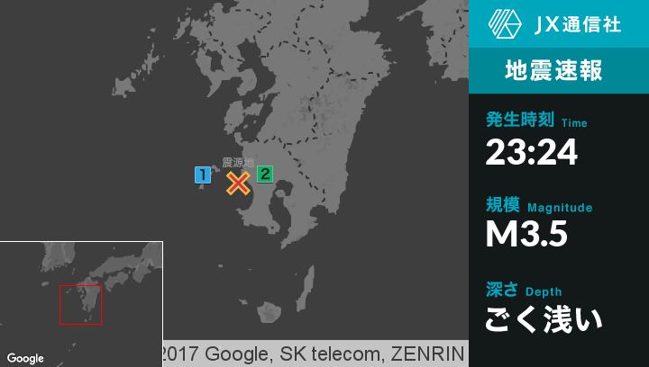 | 震度1 | 鹿児島市, 阿久根市, 薩摩川内市甑島 |