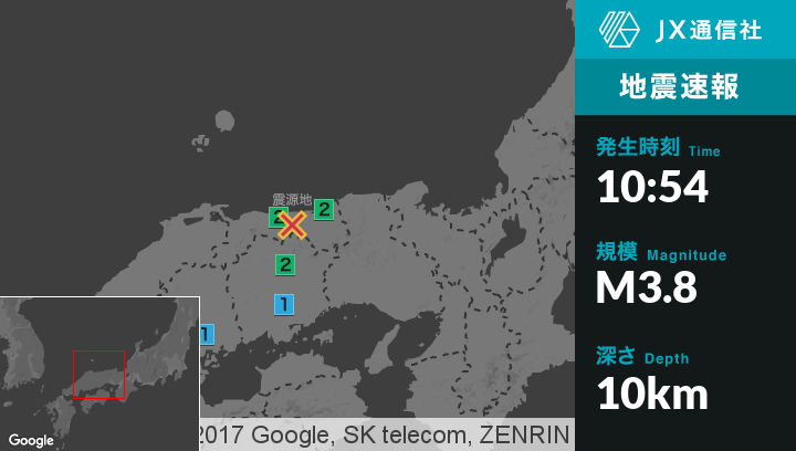 | 震度2 | 鳥取市, 倉吉市, 湯梨浜町, 北栄町, 真庭市, 鏡野町 |