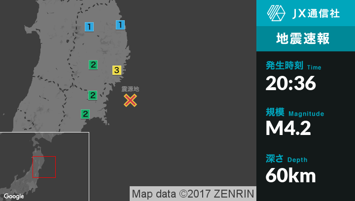 | 震度2 | 大船渡市, 一関市, 奥州市, 気仙沼市, 石巻市 |