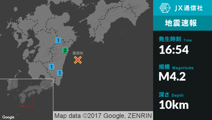 | 震度1 | 延岡市, 日向市, 西都市, 新富町, 門川町, 宮崎美郷町, 宮崎市, 日南市, 小林市, 鹿屋市 |