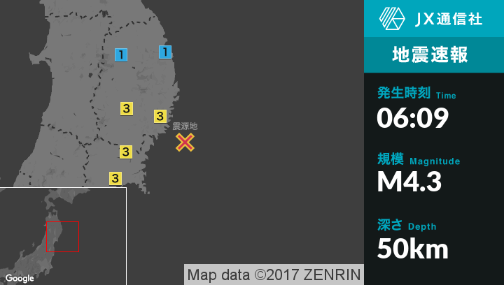 | 震度3 | 大船渡市, 一関市, 気仙沼市, 石巻市 |