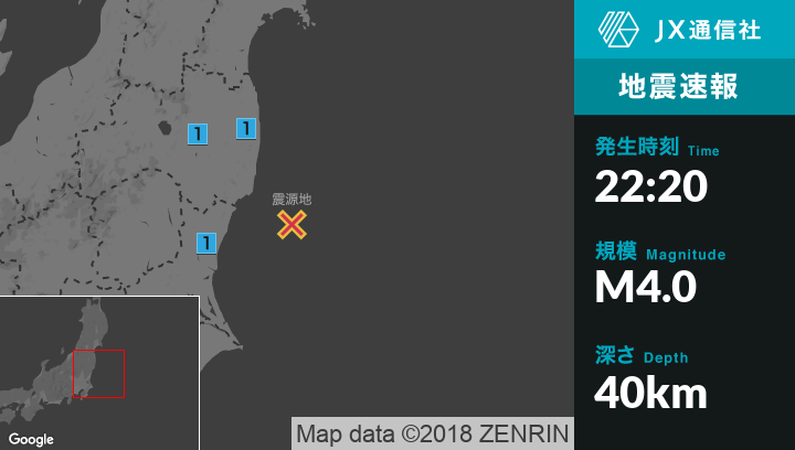| 震度1 | 田村市, 天栄村, 川内村, 大熊町, 水戸市, 日立市, 常陸太田市, 笠間市, 常陸大宮市, 東海村 |
