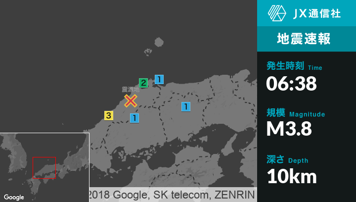 | 震度1 | 川本町, 松江市, 安来市, 奥出雲町, 飯南町, 米子市, 境港市, 鳥取日野町, 真庭市, 安芸高田市 |