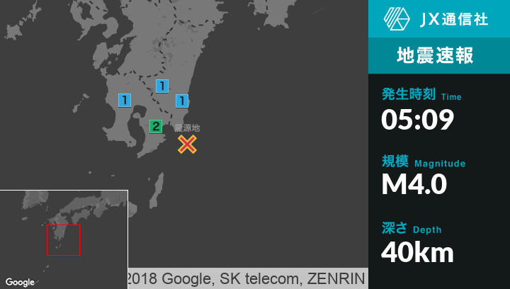 | 震度1 | 鹿屋市, 志布志市, 大崎町, 南大隅町, 肝付町, 鹿児島市, 指宿市, 串間市, 小林市 |