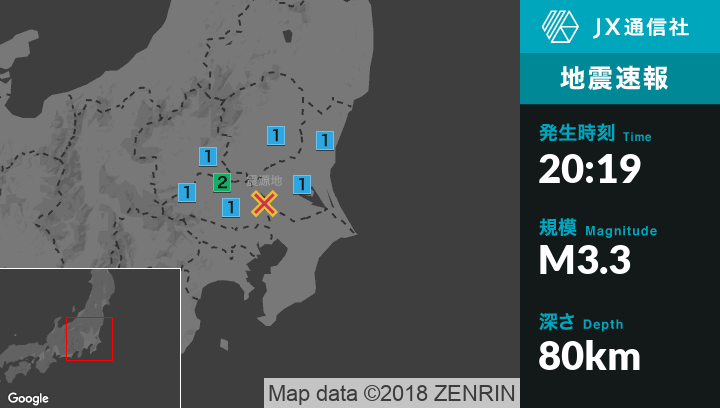| 震度1 | 熊谷市, 行田市, 東松山市, 久喜市, 滑川町, 宮代町, 長瀞町, 水戸市, 笠間市, 城里町, 結城市, 筑西市, 桜川市, 宇都宮市, 足利市, 栃木市, 佐野市, 下野市, 野木町, 桐生市, 館林市 |