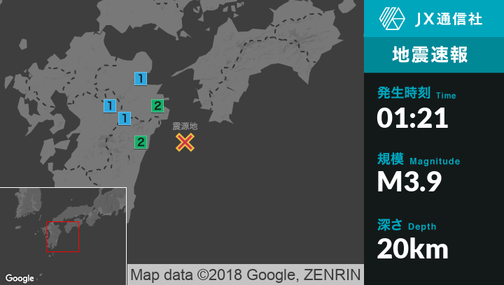 | 震度2 | 佐伯市, 豊後大野市, 延岡市, 宮崎都農町 |