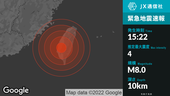 5月9日15時22分頃台湾付近で推定最大震度4の地震が発生しました