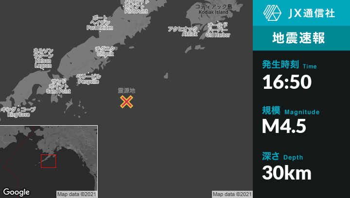 | 震源地 | アラスカのPerryvilleから南東131kmの地点 |
