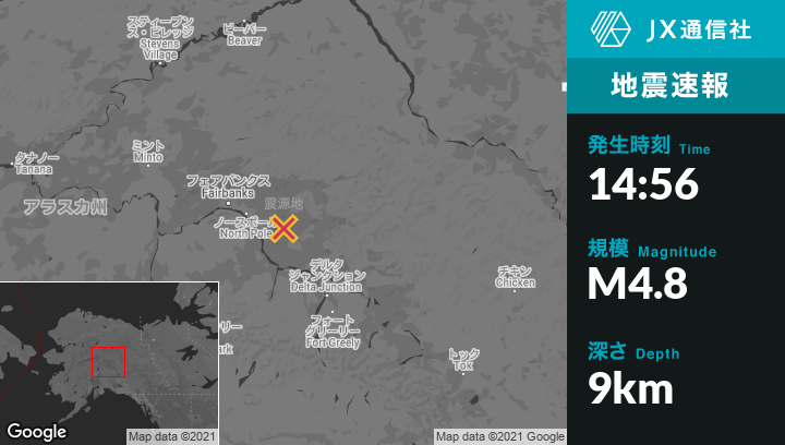 | 震源地 | アラスカのEielson Air Force Baseから東21kmの地点 |