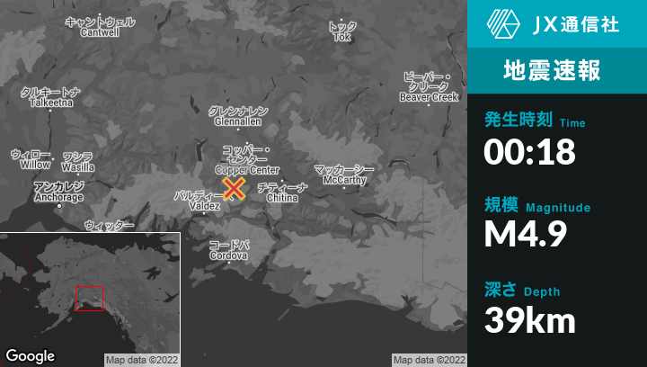 | 震源地 | アラスカのTonsinaから南西31kmの地点 |