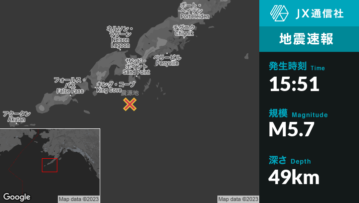 | 震源地 | アラスカのSand Pointから南南西73kmの地点 |