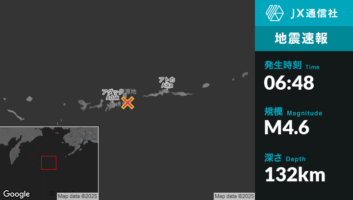 2月28日 06:48頃、アラスカのAdakから東44kmの地点でM4.6の地震がありました。