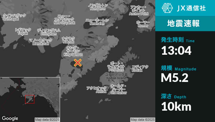 4月01日 13:04頃、アラスカのEgegikから東南東62kmの地点でM5.2の地震がありました。