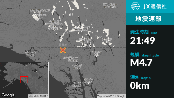 5月01日 21:49頃、アラスカのSkagwayから西北西94kmの地点でM4.7の地震がありました。