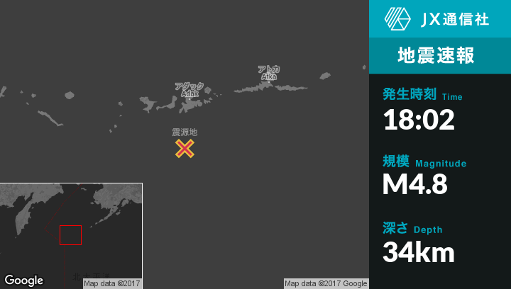 5月09日 18:02頃、アラスカのAdakから南99kmの地点でM4.8の地震がありました。