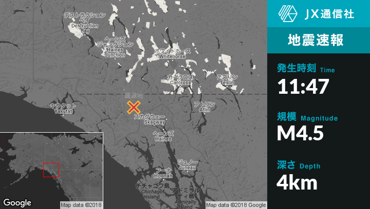 1月18日 11:47頃、アラスカのSkagwayから西北西86kmの地点でM4.5の地震がありました。