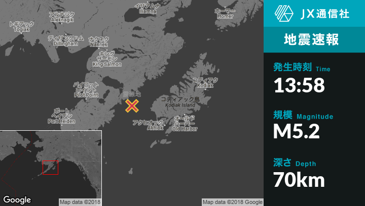 5月11日 13:58頃、アラスカのLarsen Bayから西93kmの地点でM5.2の地震がありました。