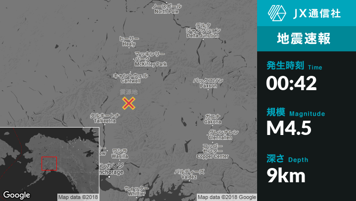 | 震源地 | アラスカのCantwellから南64kmの地点 |