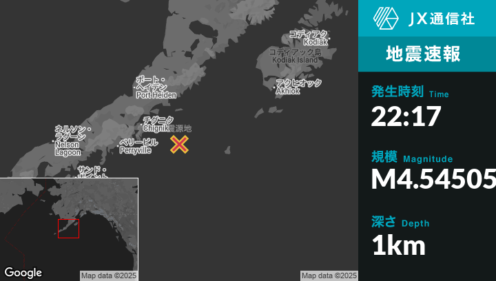 震源地アラスカのChignikから東南東81kmの地点