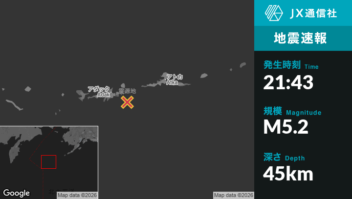 | 震源地 | アラスカのAdakから東南東55kmの地点 |