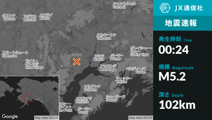2月05日 00:24頃、アラスカのBelugaから北北西47kmの地点でM5.2の地震がありました。