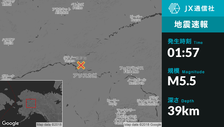 | 震源地 | アラスカのManley Hot Springsから西北西35kmの地点 |