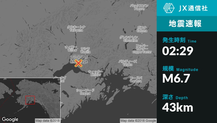 | 震源地 | アラスカのAnchorageから北北西11kmの地点 |