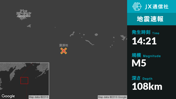 | 震源地 | アラスカのKiska Volcanoから南南西126kmの地点 |