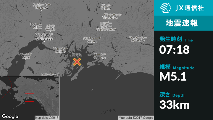 | 震源地 | アラスカのWhittierから東南東71kmの地点 |