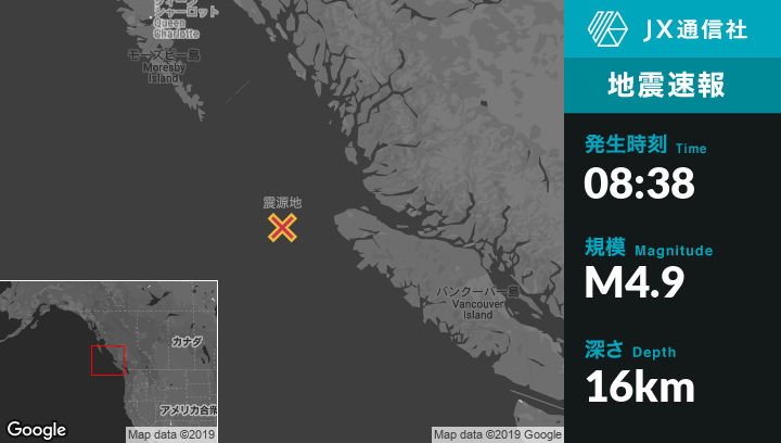 12月24日 08:38頃、カナダのPort Hardyから西141kmの地点でM4.9の地震がありました。