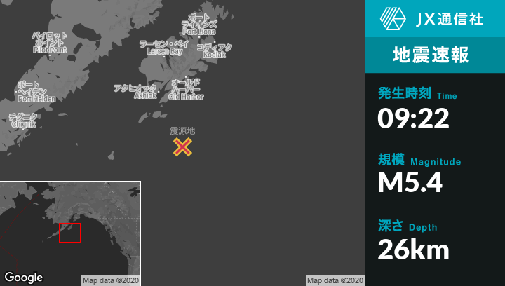 | 震源地 | アラスカのChirikof Islandから東北東140kmの地点 |