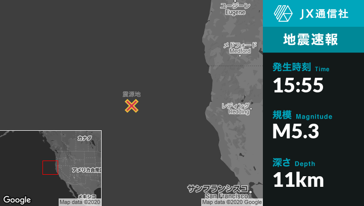 5月18日 15:55頃、カリフォルニアのFerndaleから西283kmの地点でM5.3の地震がありました。