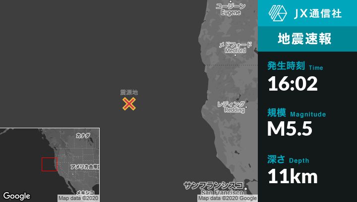 5月18日 16:02頃、カリフォルニアのFerndaleから西283kmの地点でM5.5の地震がありました。